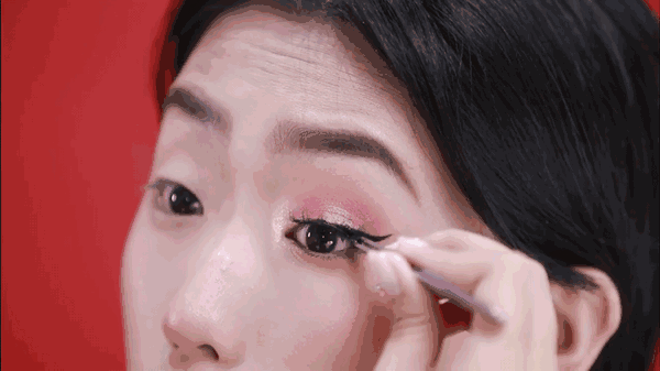 用眼线笔,填充睫毛根部画好内眼线,并画一个略微上扬的眼尾。用睫毛膏,刷出浓密的睫毛。